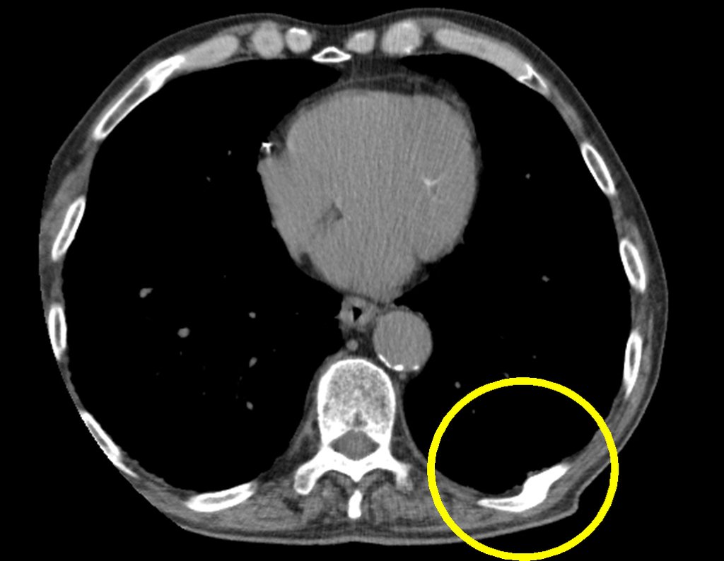 A tomografia axial de tórax evidenciou características de um pulmão de fumante crônico, com áreas de teleangiectasia, congestão vascular e enfisema pulmonar. Entretanto, a tomografia não confirmou a presença do nódulo pulmonar observado nas radiografias iniciais. Em vez disso, foram encontradas alterações no nono e décimo arco costal posterior esquerdo, sugerindo um calo de fratura.